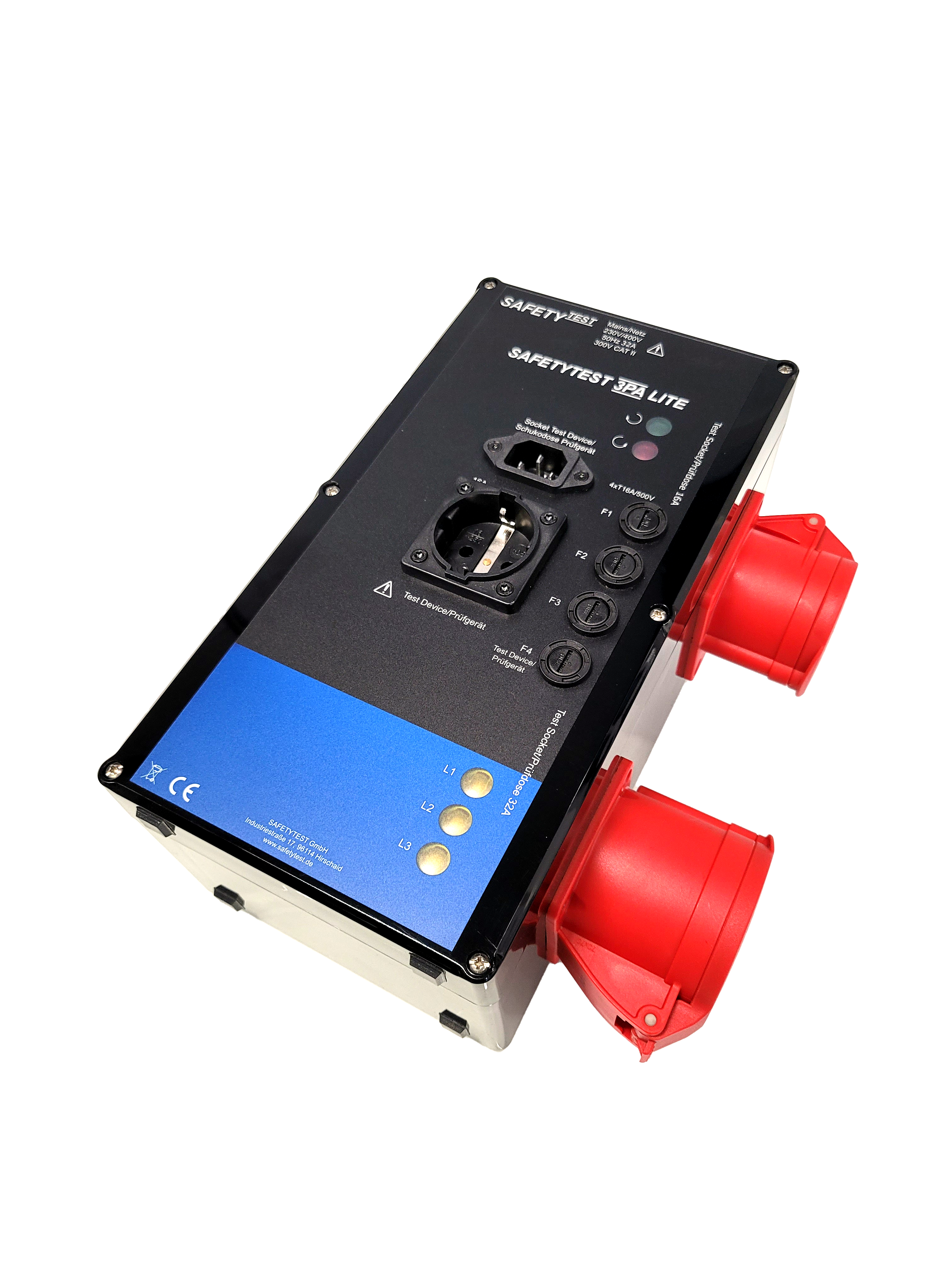 Der Messadapter SAFETYTEST 3PA ermöglicht die aktive Überprüfung von 400 V, 16 A und 32 A Geräten sowie Verlängerungsleitungen in Verbindung mit einem unserer 1-phasigen Prüfgeräte.